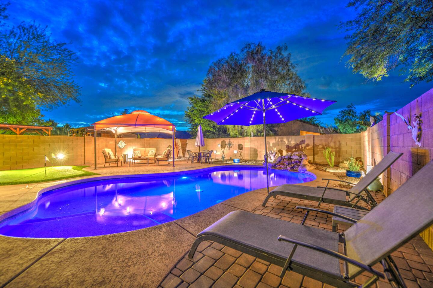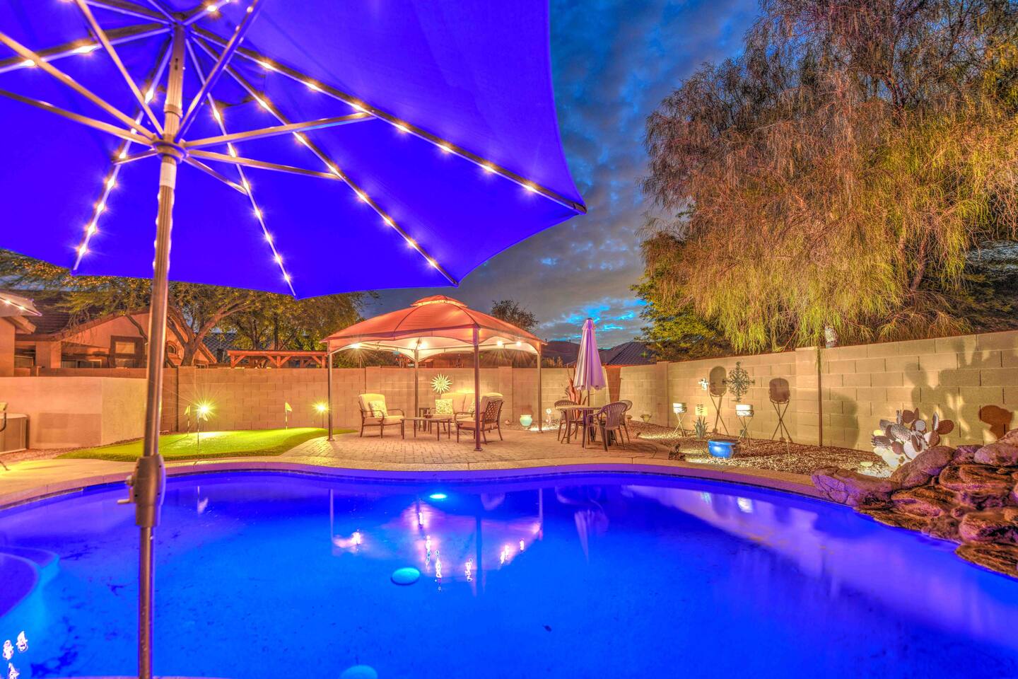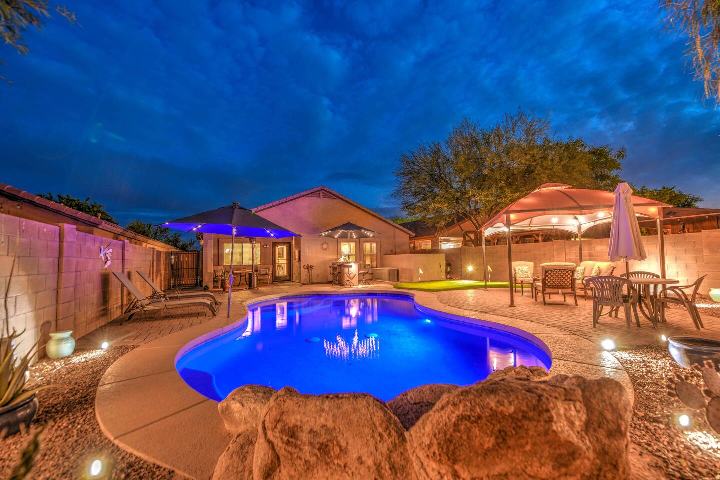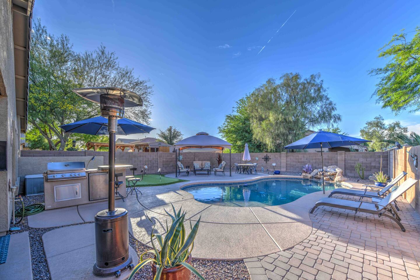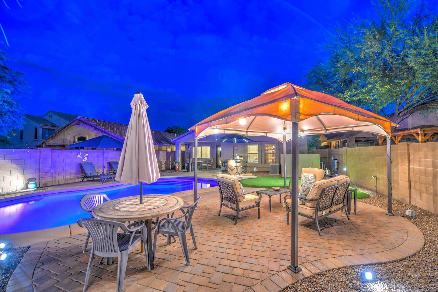 Welcome to Desert Diamond Escape! Your own slice of paradise in San Tan Valley, AZ! Our impeccably furnished 1500 square foot retreat, boasting three cozy bedrooms and two luxurious bathrooms. Dive into relaxation in our 12,000 gallon salt water pool complete with a soothing waterfall. Unwind in our outdoor oasis featuring a charming gazebo, BBQ, lounge sets, putting green. Fully stocked kitchen, 4 TVs, fiber internet. Don't miss this exceptional experience! - Pool heat is an additional fee.