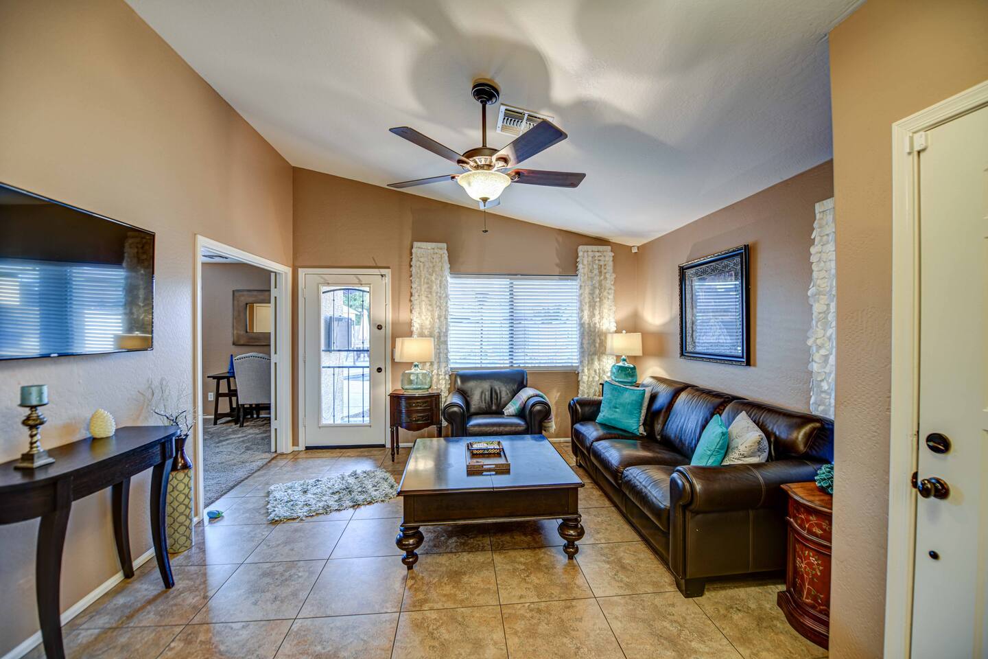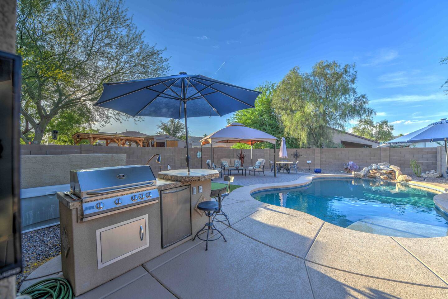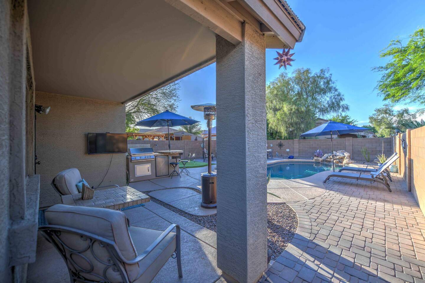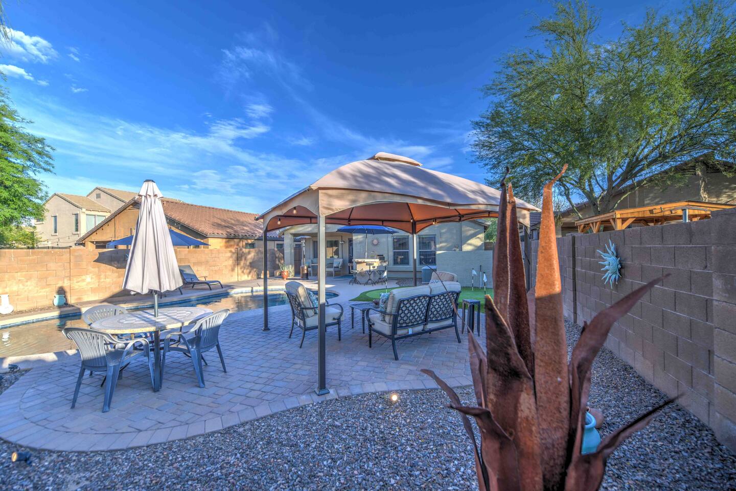 Welcome to Desert Diamond Escape! Your own slice of paradise in San Tan Valley, AZ! Our impeccably furnished 1500 square foot retreat, boasting three cozy bedrooms and two luxurious bathrooms. Dive into relaxation in our 12,000 gallon salt water pool complete with a soothing waterfall. Unwind in our outdoor oasis featuring a charming gazebo, BBQ, lounge sets, putting green. Fully stocked kitchen, 4 TVs, fiber internet. Don't miss this exceptional experience! - Pool heat is an additional fee.