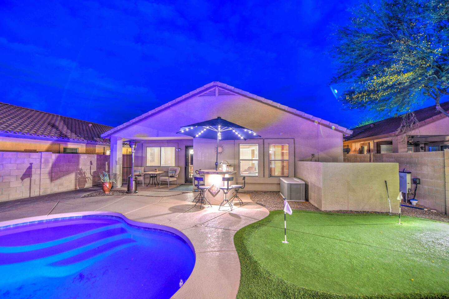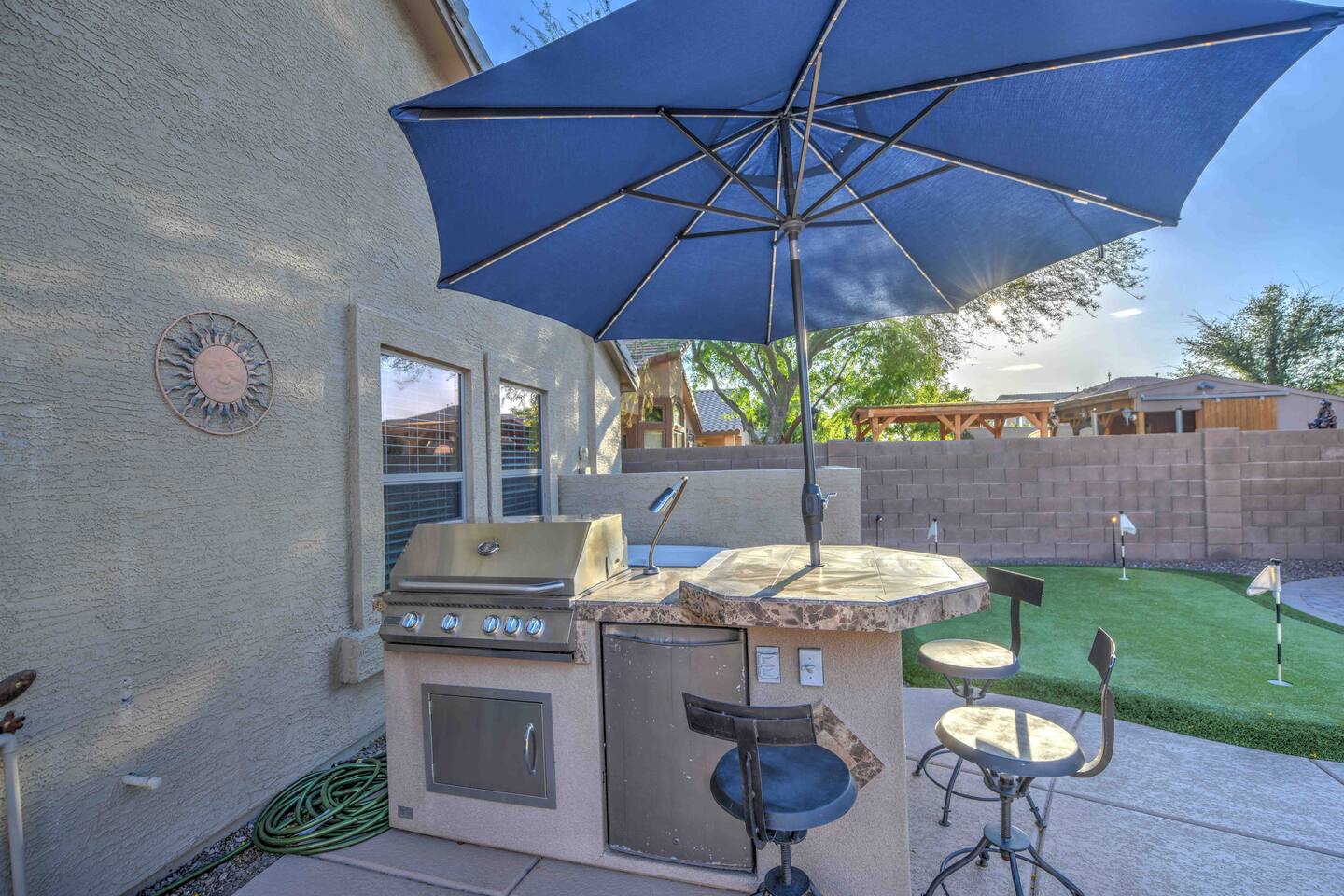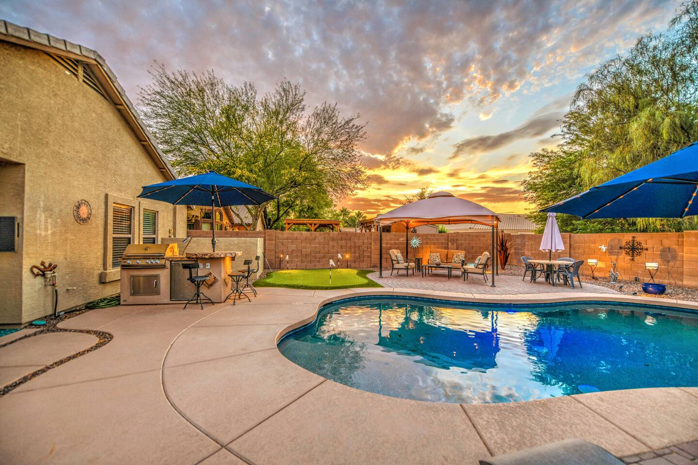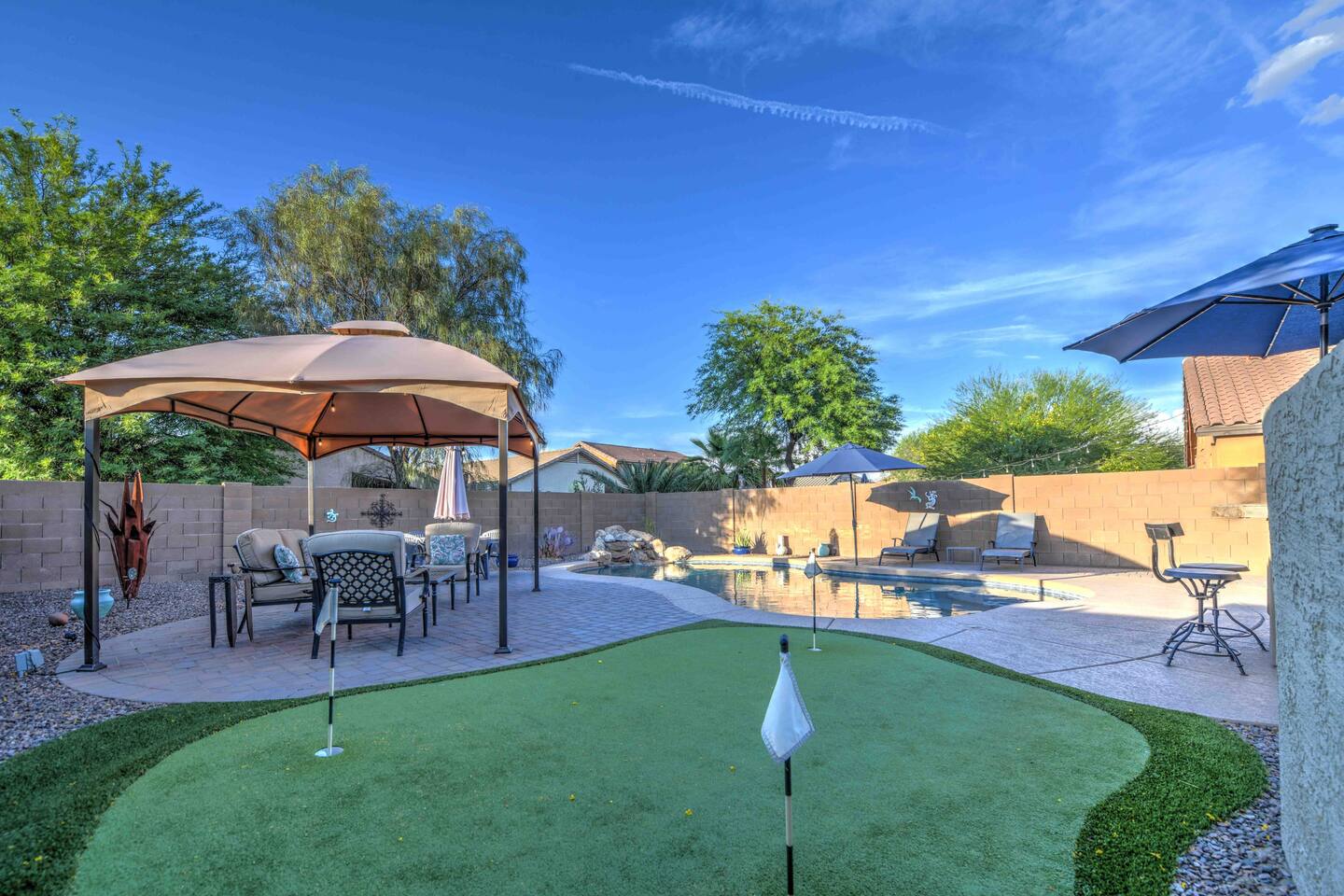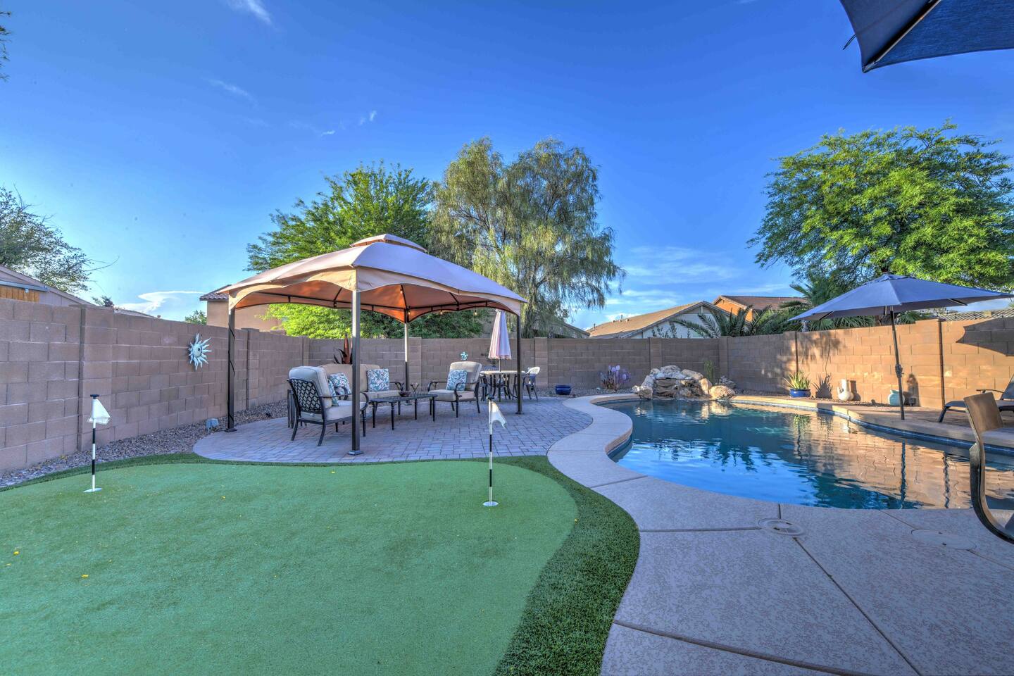 Welcome to your dream vacation retreat! Just 45 min south of Sky Harbor Airport lies our serene oasis. Nestled in a desert scaped backyard, you'll find a private pool complete with a soothing waterfall, perfect for unwinding under the sun. Adjacent is a BBQ bar area for al fresco dining and a gazebo with a cozy conversation set, ideal for evening gatherings. Sharpen your putting skills on the private green before cooling off in the pool. Inside, discover a spacious 3-bedroom, 2-bathroom layout with a den, equipped with a work desk for productivity. The fully stocked kitchen boasts stainless steel appliances, a water softener, and reverse osmosis system for pristine drinking water. Feel at home with amenities such as a washer and dryer, ironing board, and garage parking. Stay connected with fiber internet speeds up to 1050 Mbps, while LED pool lights set the mood for evening swims. There are three heated Johnson Ranch Pools with hot tubs close by as well. Access to a 9 hole pitch and putt par-3 golf course, use of the tennis/pickleball courts, parks, and soccer fields. ************************** Service Animals & Emotional Support Animals Policy At our property, we respect and comply with Airbnb's policies regarding service animals and emotional support animals. To ensure a smooth experience for all, guests traveling with service animals are strongly encouraged to notify us in advance. As per Airbnb’s policy, guests must confirm that their service animal is necessary due to a disability and specify the tasks the animal is trained to perform. Please note that emotional support animals are not permitted at our residence, in accordance with Airbnb guidelines, and we reserve the right to decline these requests. Our property maintains a strict no-pet policy due to allergy concerns and the additional cleaning required. Furthermore, should there be any evidence of pet hair or additional cleaning needed after a guest’s stay, an additional cleaning fee of $250 or more may be applied in line with Airbnb's policies. We appreciate your understanding and cooperation in helping us maintain a clean, safe, and comfortable environment for all guests.